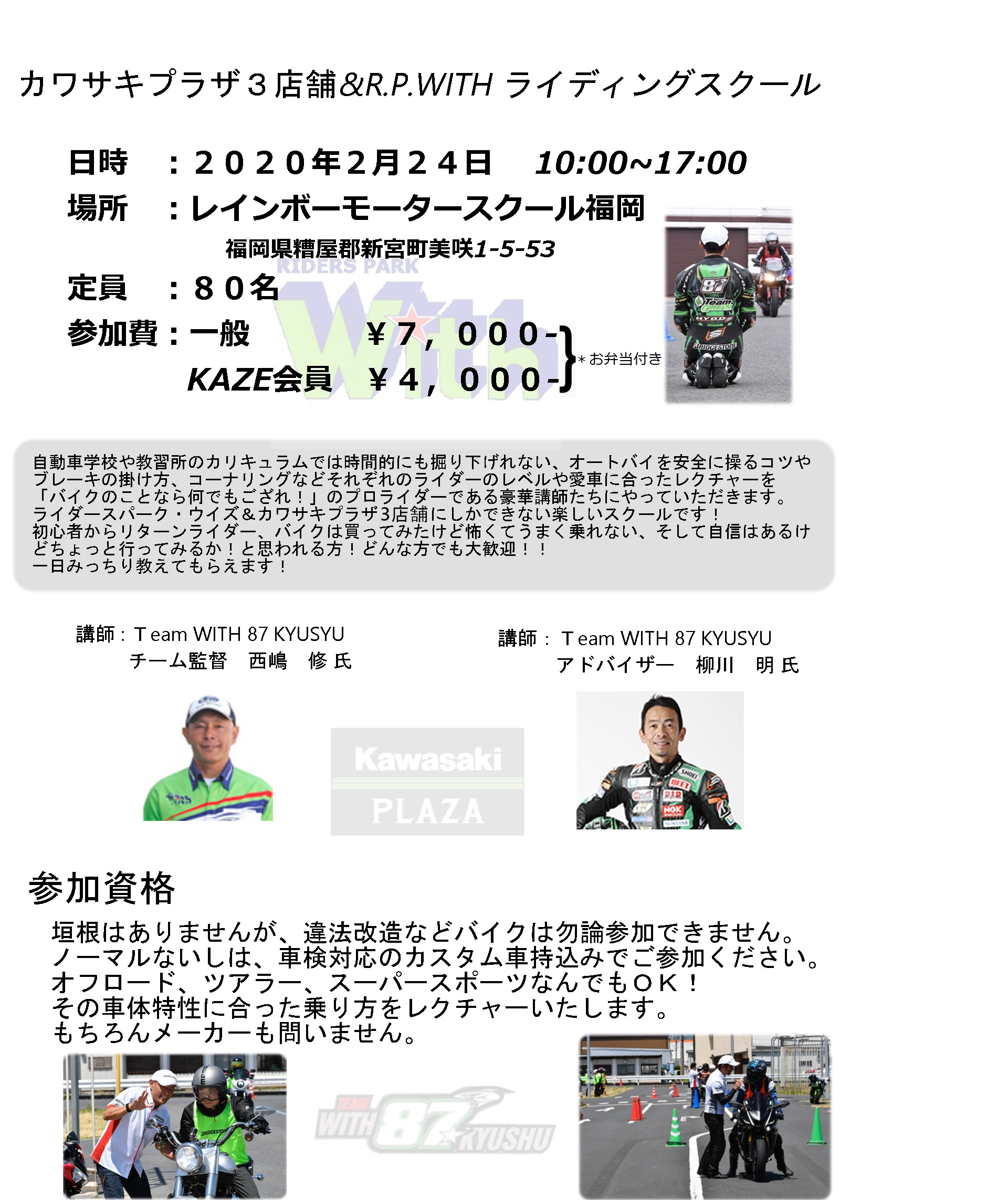 TeamWITH87KYUSHU ライディングスクール イベント詳細 日付: 2020年2月24日 カテゴリ: イベント 2/24 ㈪ 天皇誕生日の振り替え休日 下記4店合同のライディングスクールです。 カワサキプラザ福岡東・カワサキプラザ福岡西・カワサキプラザ博多・ライダースパーク・ウイズ お申し込みは各店でお願い致します。 ライディングスクールタイムスケジュール 申込書